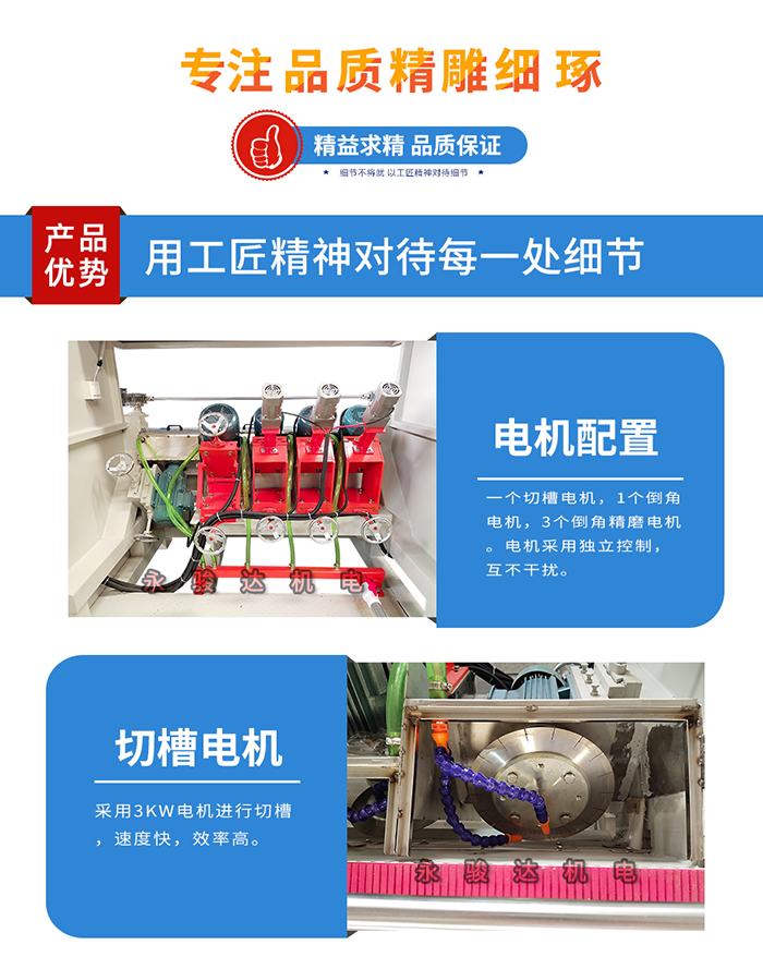 巖板45度倒角機(jī)主要用于各類巖板倒45度角加工,做無縫拼接使用。通過前面開槽、切角、45度倒角等工藝組合,采用同步壓帶式輸送,增加工件加工穩(wěn)定。做到45度前后均勻,無大小頭。開槽位方便黏膠凝固,粘接更加美觀。角度、厚度、速度參數(shù)程序自動調(diào)節(jié),切換產(chǎn)品更方便簡單。