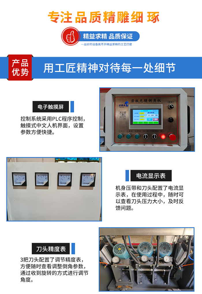 - 特點: 永駿達全新巖板45度倒角機,配置三個刀頭,一個4KW高速變頻電機,2個3KW精磨電機,倒角速度一分鐘可達2米長。這款巖板無縫倒角機設置了刀頭自動翻轉功能,一件啟動,就可以翻轉刀頭,更換刀片和磨頭更方便
